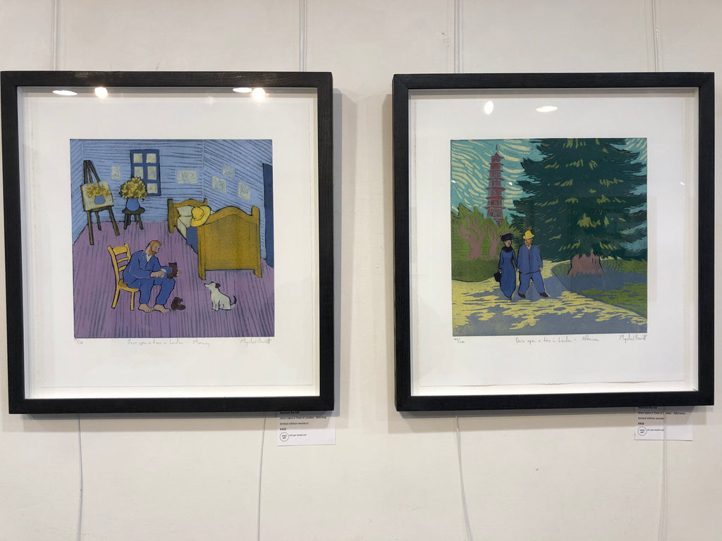 Mychael thought that this was such a lovely idea that he decided to give the same treatment to the life of Vincent Van Gogh. In his narrative, Vincent, who had spent a very happy time as a young man in London, decided to return here after the artistically glorious but personally disastrous time spent in the south of France. This series shows some anecdotal moments from his life in London in which he has a dog, a girlfriend and an exhibition at the Chelsea Arts Club where of course all his paintings sold.