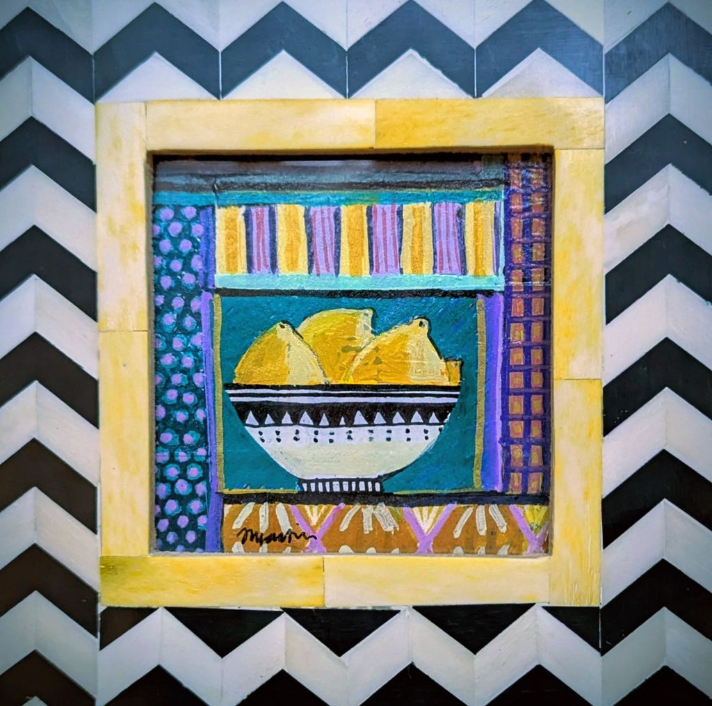 Jenny Martin RSW 'Tiny Jewelled Painting - Bowl of Lemons' mixed media on board 13x13cm (18x18cm framed)