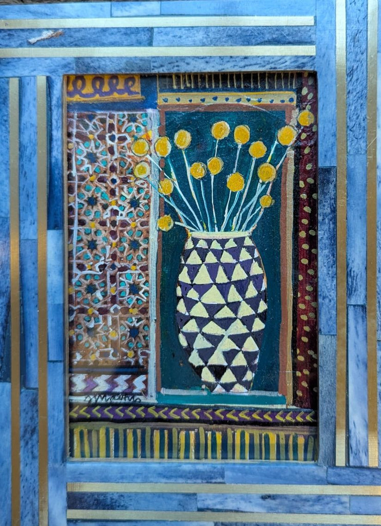 Jenny Martin RSW 'Tiny Jewelled Painting - Seville Tiles' mixed media on board 15x10cm (22x17cm framed)