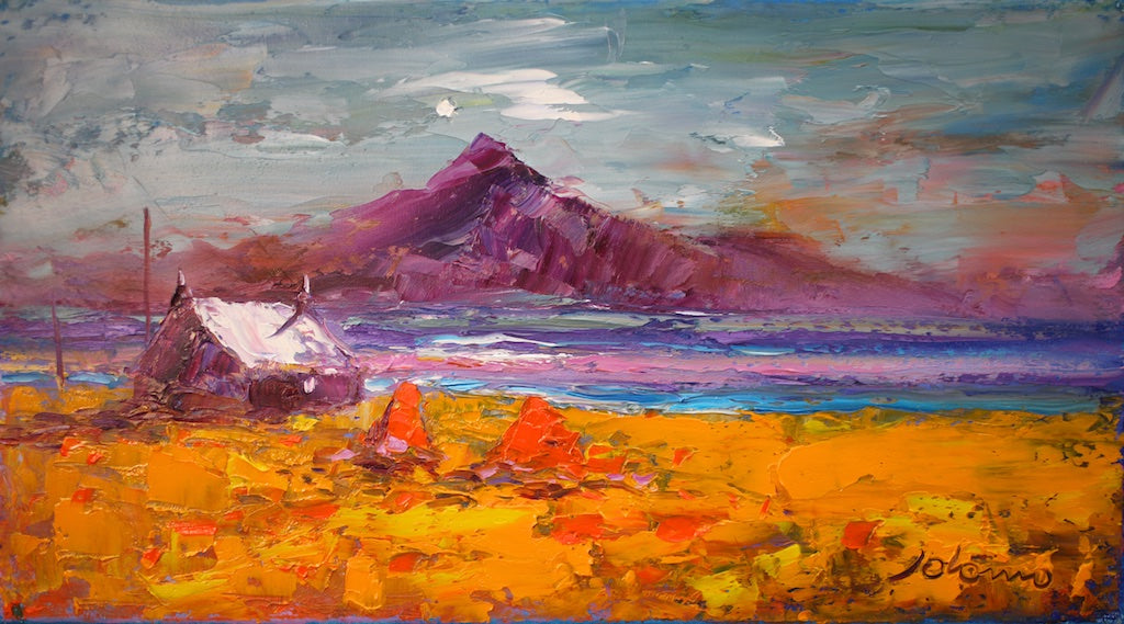 John Lowrie Morrison OBE (Jolomo) 'Two Hay Stooks, South Uist' oil on canvas 25.5x46cm (10x18ins)